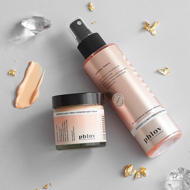 DIAMOND LOOK ist eine aufhellende Creme, die dank lichtreflektierender perliger Mikropigmente die Sichtbarkeit von Poren, Falten sowie Unvollkommenheiten reduziert und sich perfekt an jeden Teint anpasst. Sie hinterlässt eine lang anhaltend mit Feuchtigkeit versorgte, verjüngte und samtweiche Haut, die vor städtischen Umweltbelastungen geschützt ist. Der Nebel CRYSTAL MAGIC lässt die Haut natürlich strahlen sowie ausgeruht und verjüngt aussehen. Er versorgt die Haut mit Feuchtigkeit und frischt sie auf. Perfekt als Make-up-Base und Fixierer zur Verlängerung der Haltbarkeit des Make-ups.